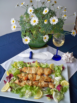 Tritare il prezzemolo con l’aglio, mescolare con un po’ di pane grattugiato, sale, pepe e olio d’oliva, con questo insaporire il pesce. Infilare in uno stecchino di legno un gambero, poi un pezzetto di calamaro, poi il tonno e così via. Accendere il forno a 180° e cuocere gli spiedini per 20 minuti, servire con una fresca insalata e limone senza dimenticare un buon vino bianco.